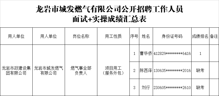 龍巖市政建設集團有限公司公開(kāi)招聘工作人員面試+實(shí)操成績(jì)排名的公示