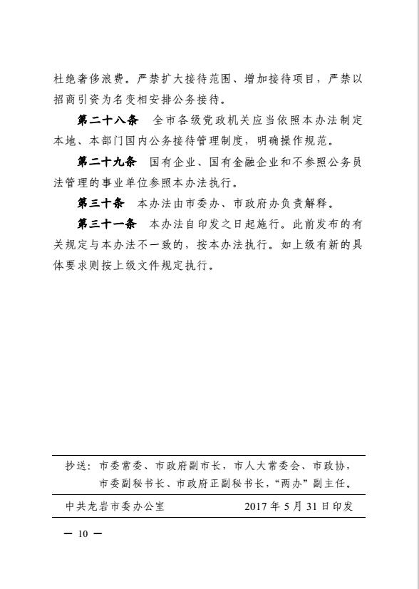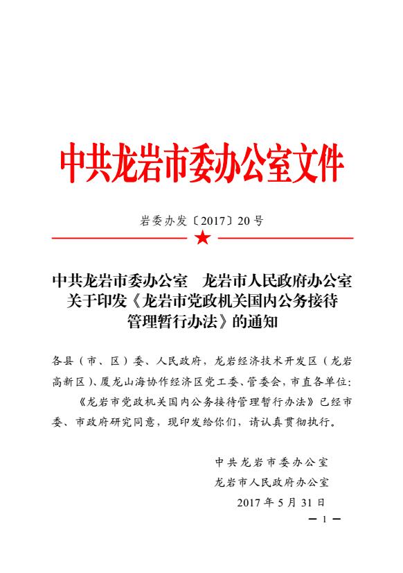 市委辦、市政府辦關(guān)于印發(fā)《龍巖市黨政機關(guān)國內公務(wù)接待管理暫行辦法》的通知(巖委辦發(fā)【2017】20號)