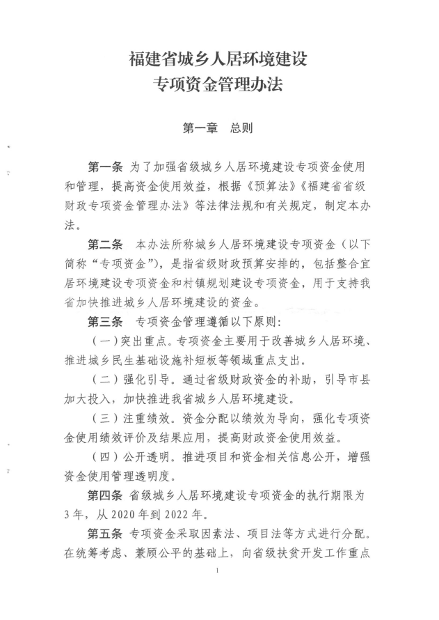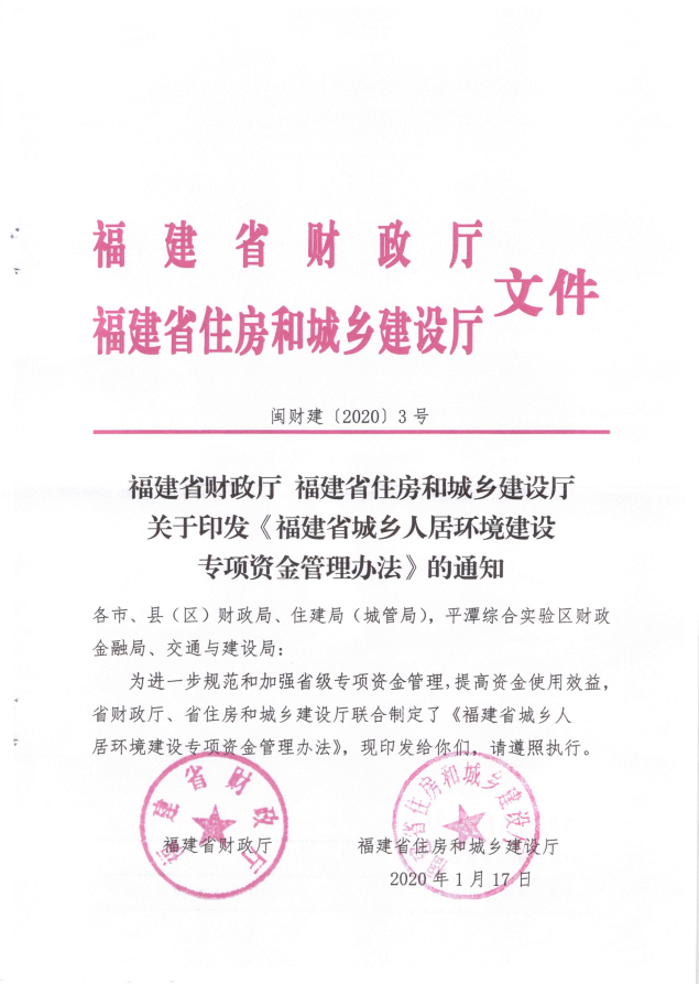 福建省財政廳福建省住房和城鄉建設廳關(guān)于印發(fā)《福建省城鄉人居環(huán)境建設專(zhuān)項資金管理辦法的通知》(閩財建[2020]3號)